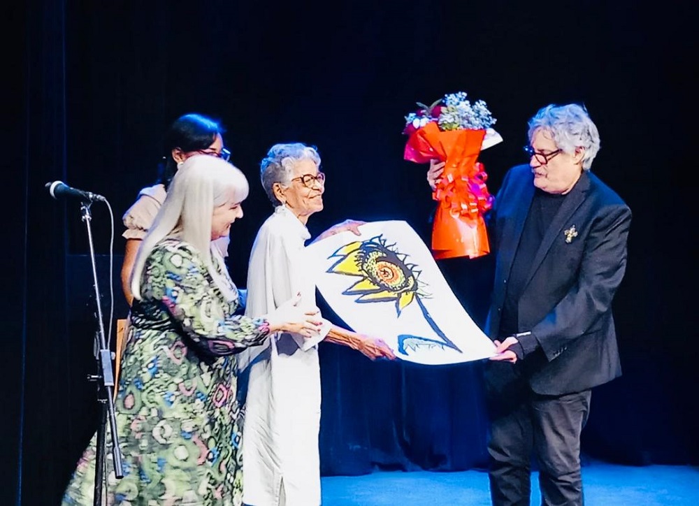 A nombre de la Uneac, Lesbia Vent Dumois le obsequió una obra suya que simboliza el reconocimiento de la organización de los artistas y escritores cubanos al legado del premiado.