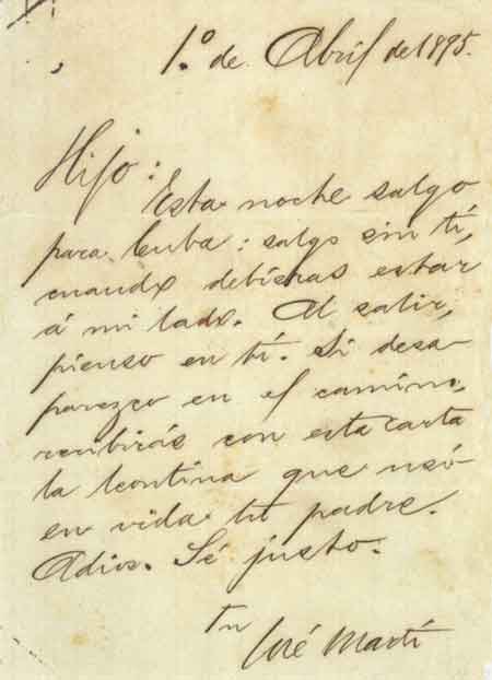 Esta noche salgo para Cuba: salgo sin ti, cuando debieras estar a mi lado. Al salir, pienso en ti. Si desaparezco en el camino, recibirás con esta carta la leontina que usó en vida tu padre. Adiós. Sé justo.
