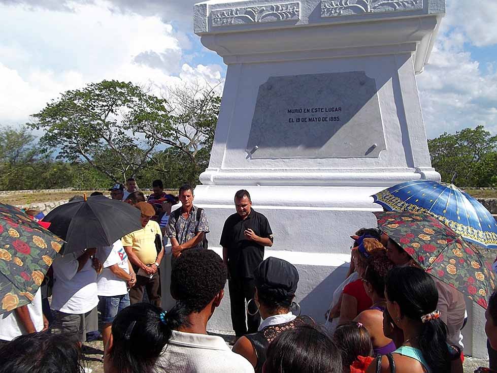 Llevaba una bandera y tomaron prestada la de La Demajagua, que ondeaba en una de las dos astas de la cima. Luego, junto al barranco, completamente cubierto de maleza, con la enseña sobre los hombros, leyó uno de esos poemas dedicados a Céspedes; le rindió tributo al patricio.