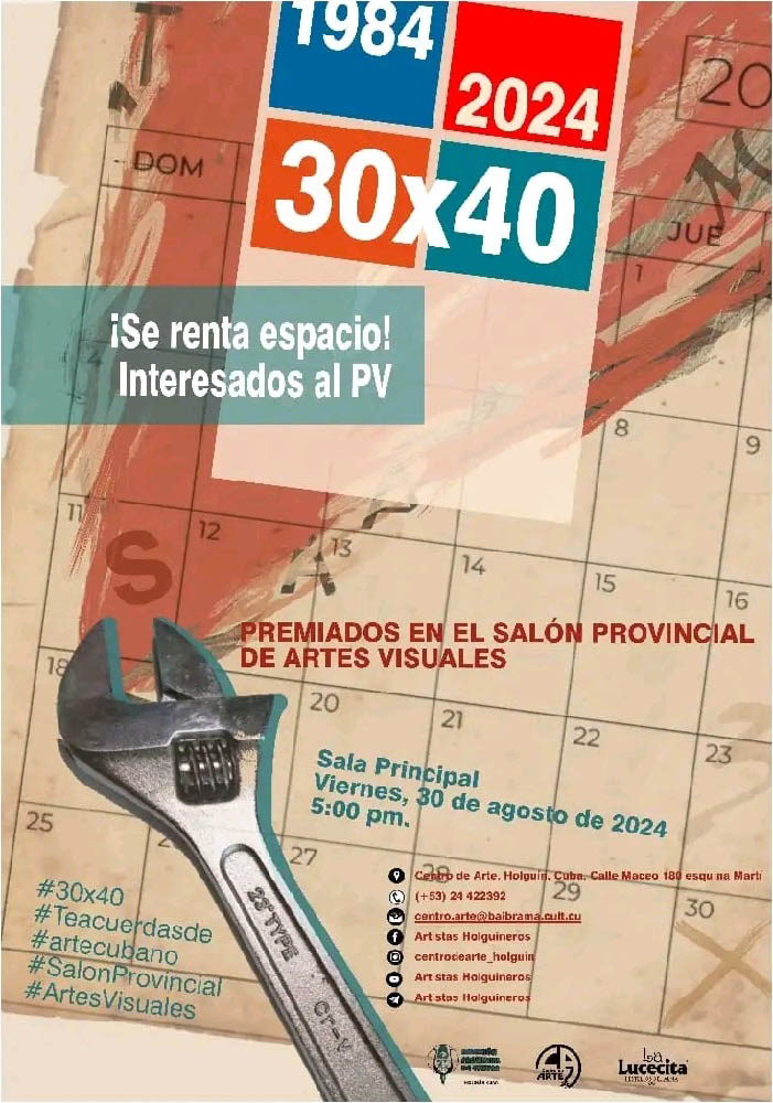 El Centro Provincial de Arte de Holguín expone, en su Sala Principal, la muestra colectiva 30×40. ¡Se renta espacio! Interesados al PV, con obras de artistas premiados en el Salón Provincial de Artes Plásticas desde su creación en 1984 y el Salón de la Ciudad, que se realiza en enero, el principal escenario de legitimación y confluencias y, al mismo tiempo, posible mapa para cartografiar los derroteros de la creación visual en Holguín.