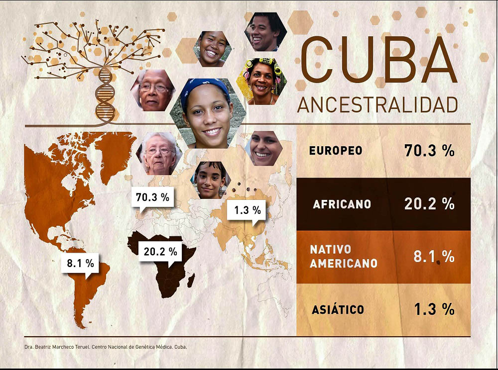 “Genéticamente mestizos según el mapa genético para el origen étnico de los cubanos (2015), con una nación donde prácticamente nadie tiene genes ancestrales puros, de un solo origen”.