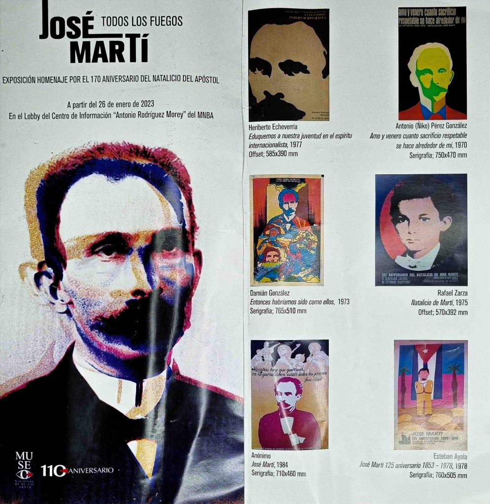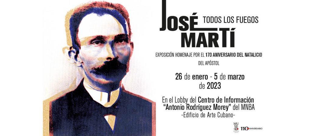 Este 2023 vino cargado de aniversarios y de muchos reconocimientos. En este caso, se cumple el 110 aniversario del Museo Nacional de Bellas Artes (MNBA) y, sobre todo, el natalicio 170 del más universal de los cubanos. El equipo de curadores e investigadores del museo —dentro del ciclo de actividades que presiden anualmente— establecieron el mes de enero como martiano. Una de las primeras iniciativas sobre el tema de la vida y obra de Martí fue la exposición José Martí, todos los fuegos, un homenaje por el 170 aniversario del natalicio del Apóstol inaugurado en el lobby del Centro de Información Antonio Rodríguez Morey de dicha institución.