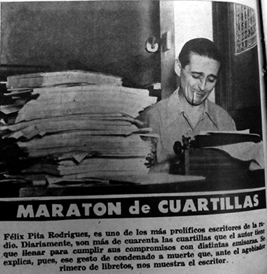 Félix Pita Rodríguez es uno de los más prolíficos escritores de la radio. Diariamente, son más de cuarenta las cuartillas que el autor tiene que llenar para cumplir sus compromisos con diversas emisoras. Se explica, pues, ese gesto de condenado a muerte que, ante el agobiador rimero de libretos, nos muestra el escritor.