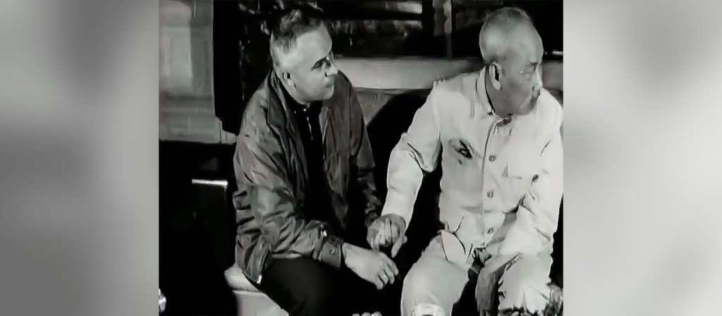 De mis encuentros con Ho Chi Minh tengo varias fotos. En mi vida de cineasta he tenido la oportunidad de conocer a muchos dirigentes, pero Ho Chi Minh era diferente. Las fotos se hicieron en el primer viaje. Él se interesó por nuestro trabajo y quiso saber cómo andaba Cuba. Encontró tiempo para atendernos, para conversar, tomar té… Nos decía que el primer viaje que realizaría, al terminar la guerra con Estados Unidos, sería una visita a Cuba. Fumó todo el tiempo y después nos acompañó por esta escalera. Su presencia era tan frágil. Estábamos filmando lo que después fue Hanoi, martes 13, mi primer filme sobre Vietnam. Los catorce viajes que hicimos para filmar la guerra y la reconstrucción se convirtieron en once películas documentales sobre la península de Indochina.