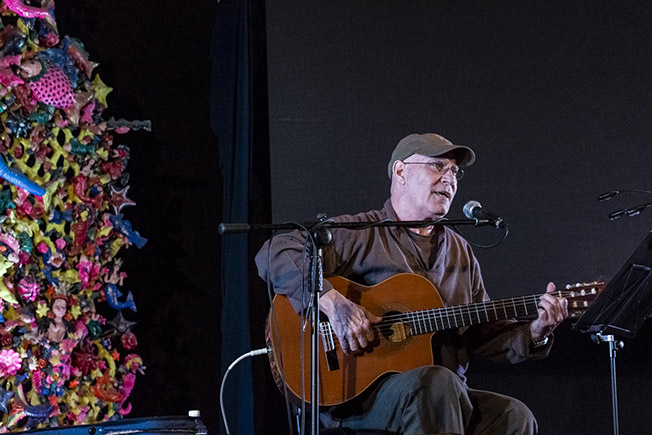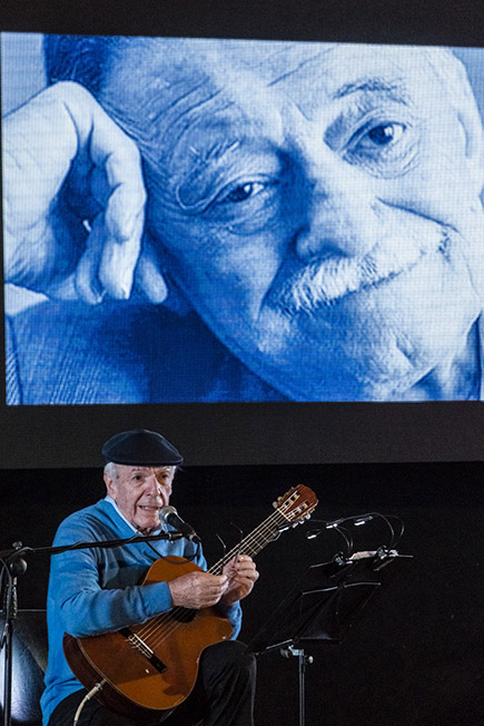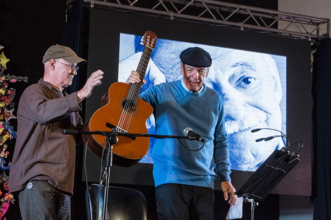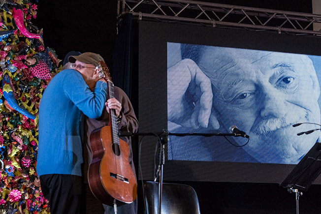 El Tinto entregó la guitarra y su abrazo del tiempo a Viglietti. Se sentó el cantor, encendió las lucecitas de su atril y comenzó a contar sus andares durante décadas con Benedetti, las memorables giras haciendo recitales juntos, y aquella pena de que nunca se diera la oportunidad de hacer un concierto “A dos voces” en Cuba.