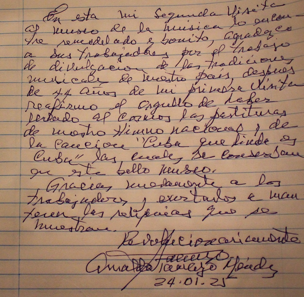 El cosmonauta cubano Arnaldo Tamayo Méndez realizó una memorable visita al Museo Nacional de la Música, donde tuvo la oportunidad de compartir anécdotas y experiencias relacionadas con su histórico viaje al espacio. Durante este encuentro, Tamayo firmó el Libro de visitas del museo y relató momentos inolvidables sobre algunos de los objetos que llevó consigo durante su misión espacial.