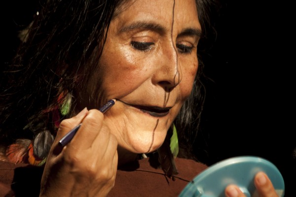 El vestuario de todos los personajes está sobre su cuerpo, a medida que va interpretándolos se despoja de esas ropas y ahí abajo está apuntado el próximo ser. Más que una solución escénica que permita el rápido cambio de vestuario, este recurso alude también a la esencia de Confesiones. Como las capas de una cebolla, todos los personajes forman parte de ella, que lleva sus marcas. Esas marcas invisibles que luego exhibe su cuerpo semidesnudo en un acto de rebeldía y homenaje a las mujeres indígenas.